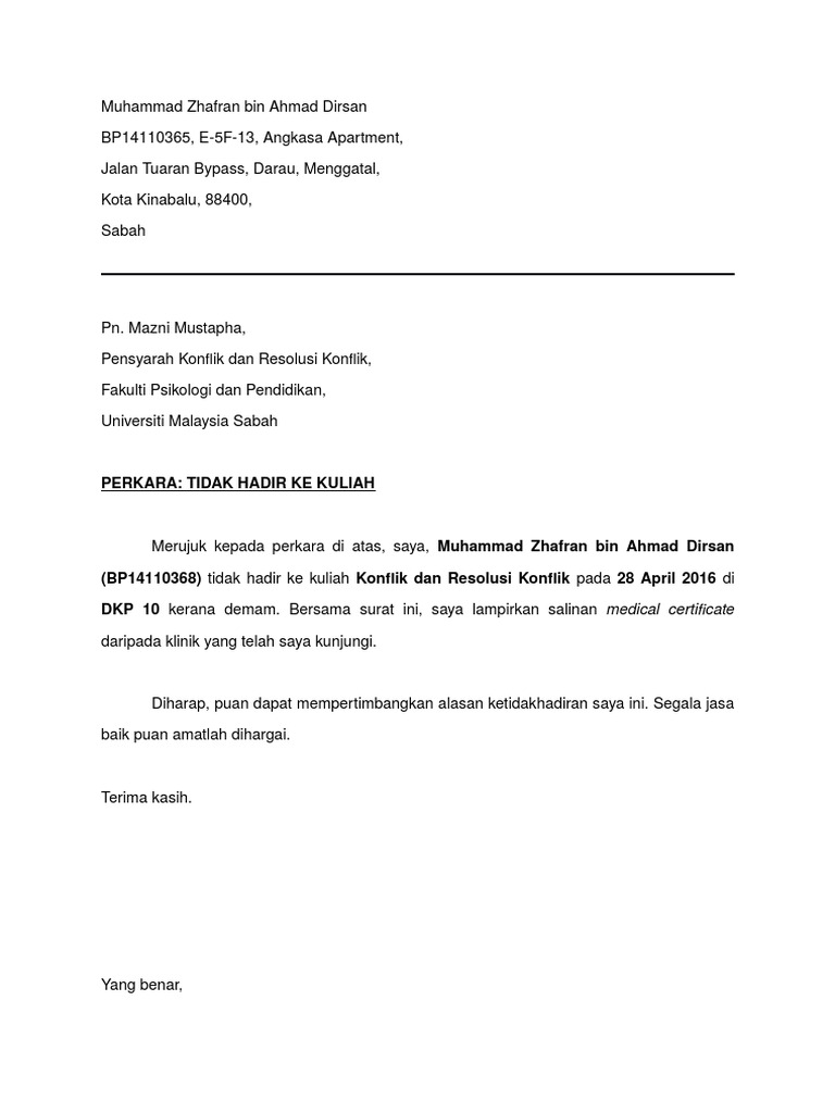 Contoh Surat Mc Contoh surat rasmi pemberitahuan tidak hadir bekerja richard gusang blok t 7 taman sentosa 85300 penampang sabah. Maybe you would like to learn more about one of these. We did not find results for.